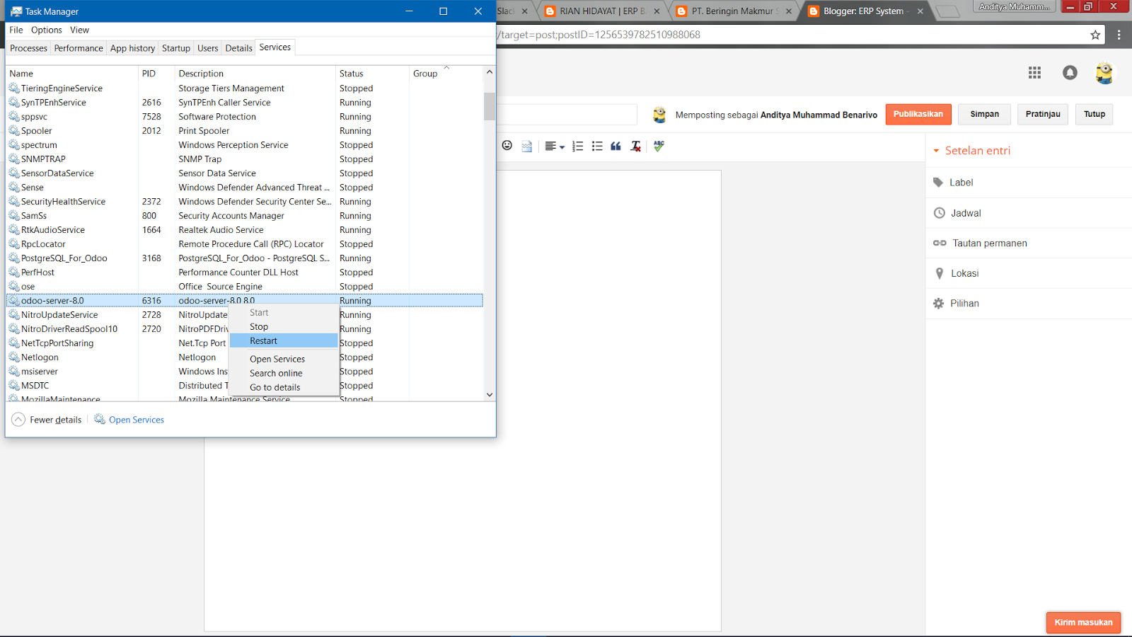 | Setelah Odoo Terinstal, Buka Task Manager dan restart Odoo |