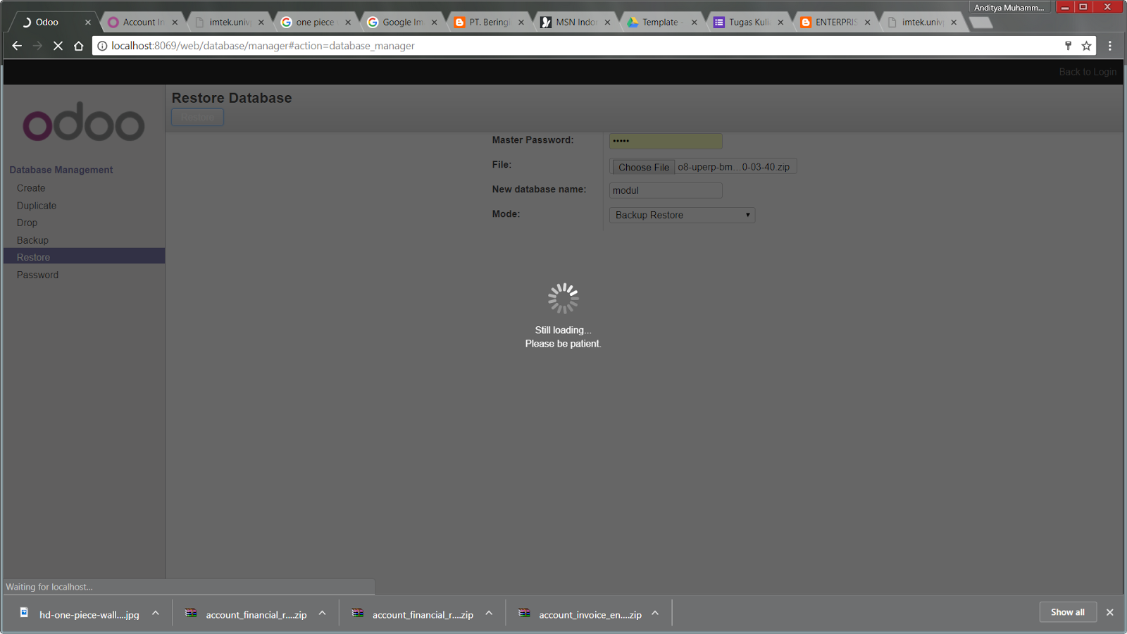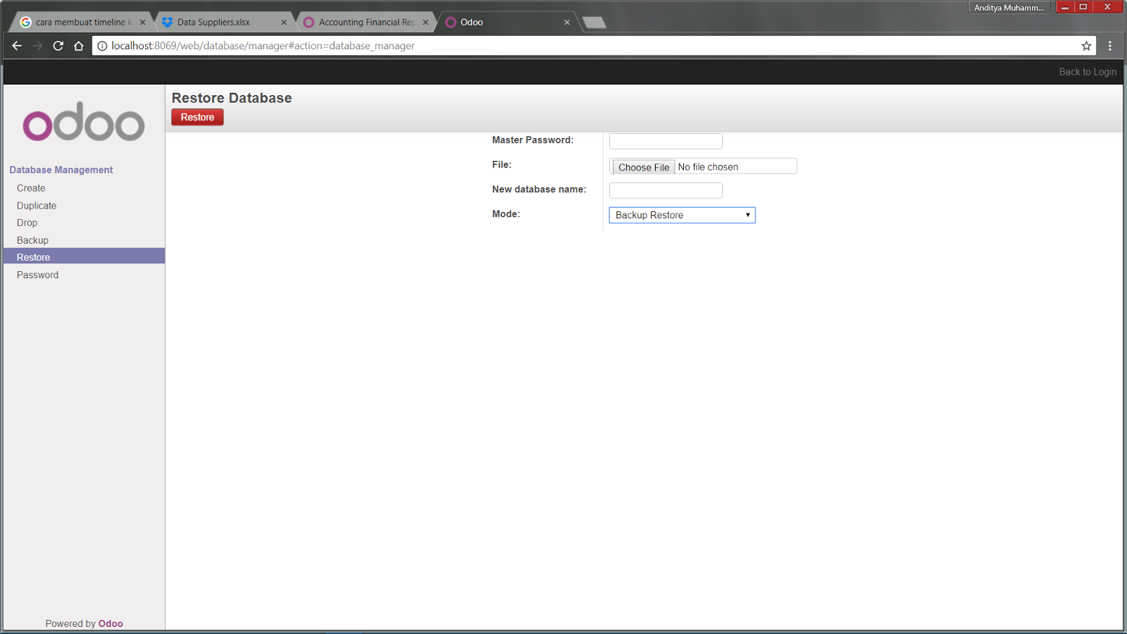 | Buka localhost:8069 lalu pilih restore data kelompok |