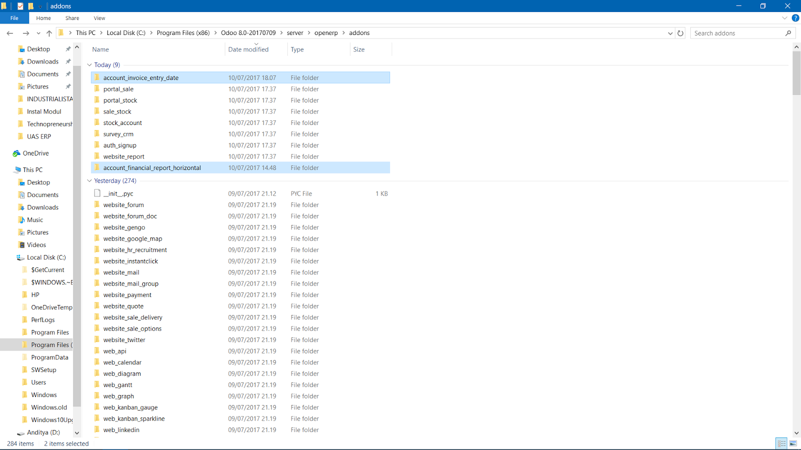 | File download add on tadi di extract dari .rar menjadi file biasa lalu di pindahkan ke local disk c, Odoo 8.0, server, lalu add ons. |