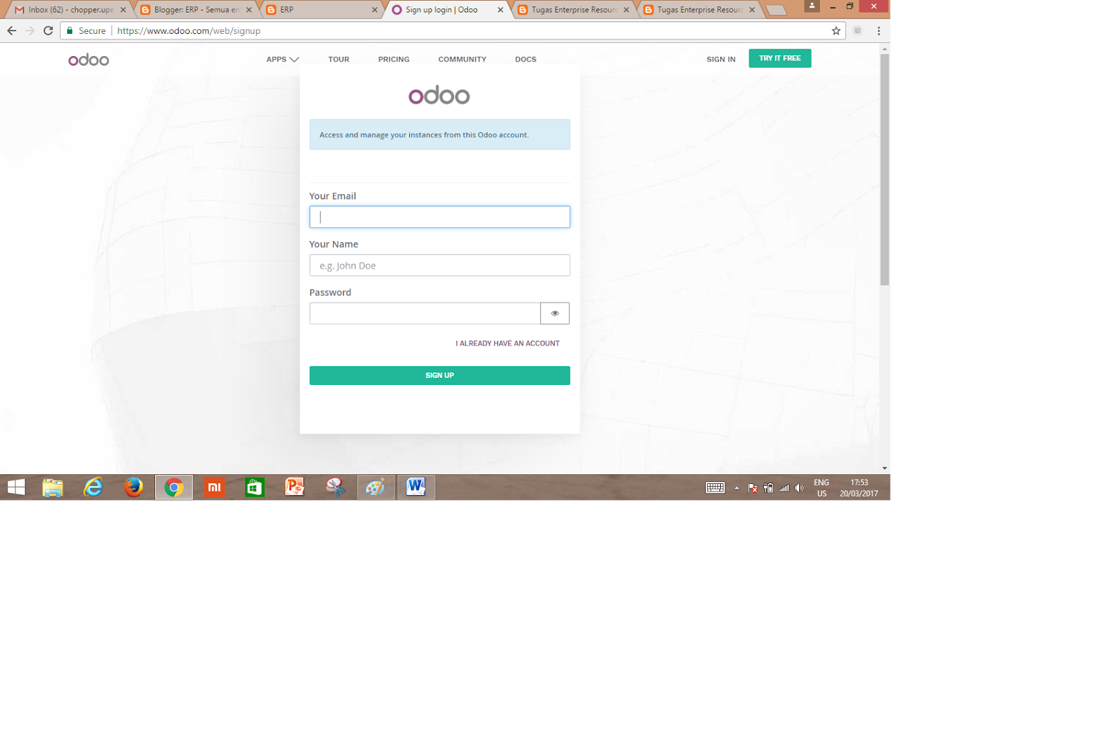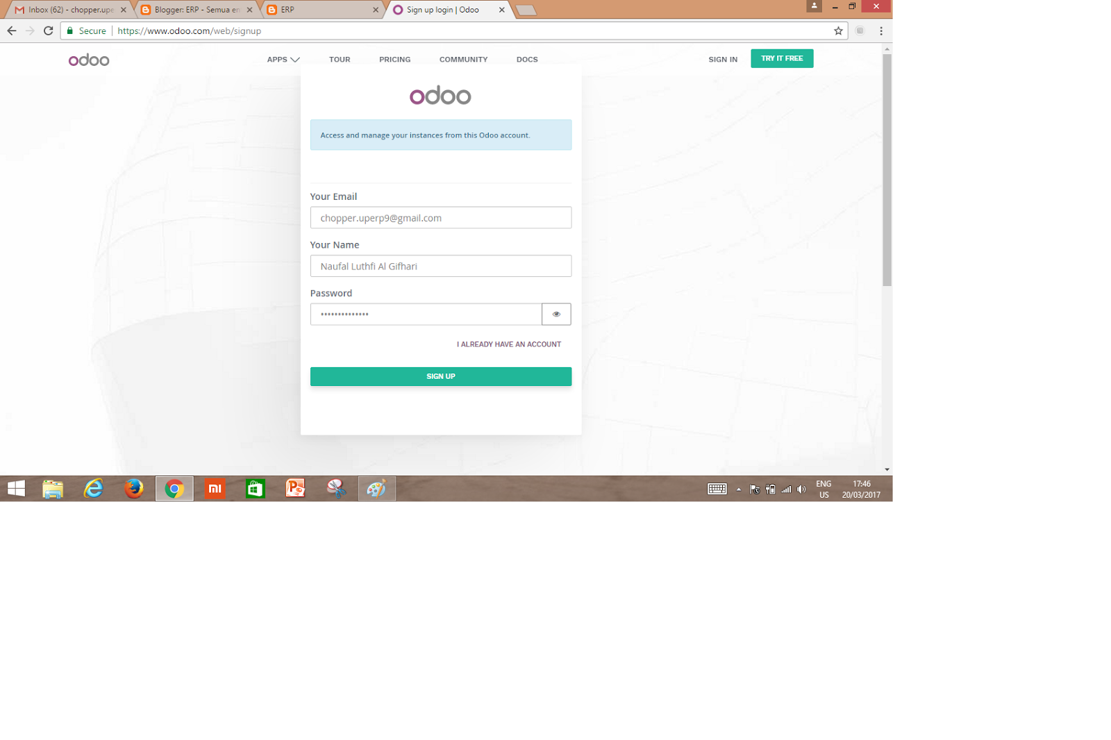 berikut langkah-langkah membuat akun odoo :