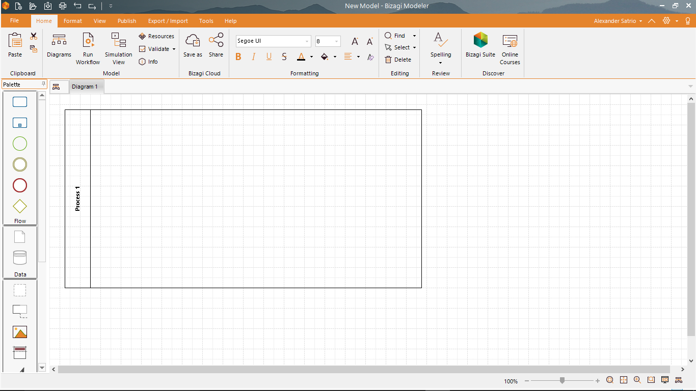 Perlu diketahui, bahwa ketika anda baru pertama kali membuka bizagi, maka anda akan diminta untuk membuat akun bizagi untuk bisa menggunakan software tersebut. Karena saya telah membuat, maka permintaan tersebut tidak mucul kembali.