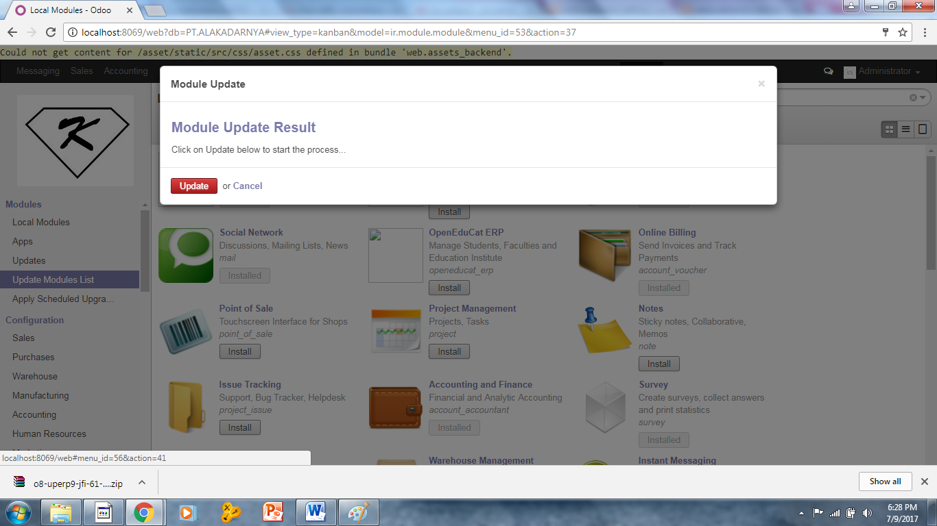 - Setelah kedua file di ekstrak pada folder yang telah saya sebutkan, maka buka odoo dan lakukan update modul list