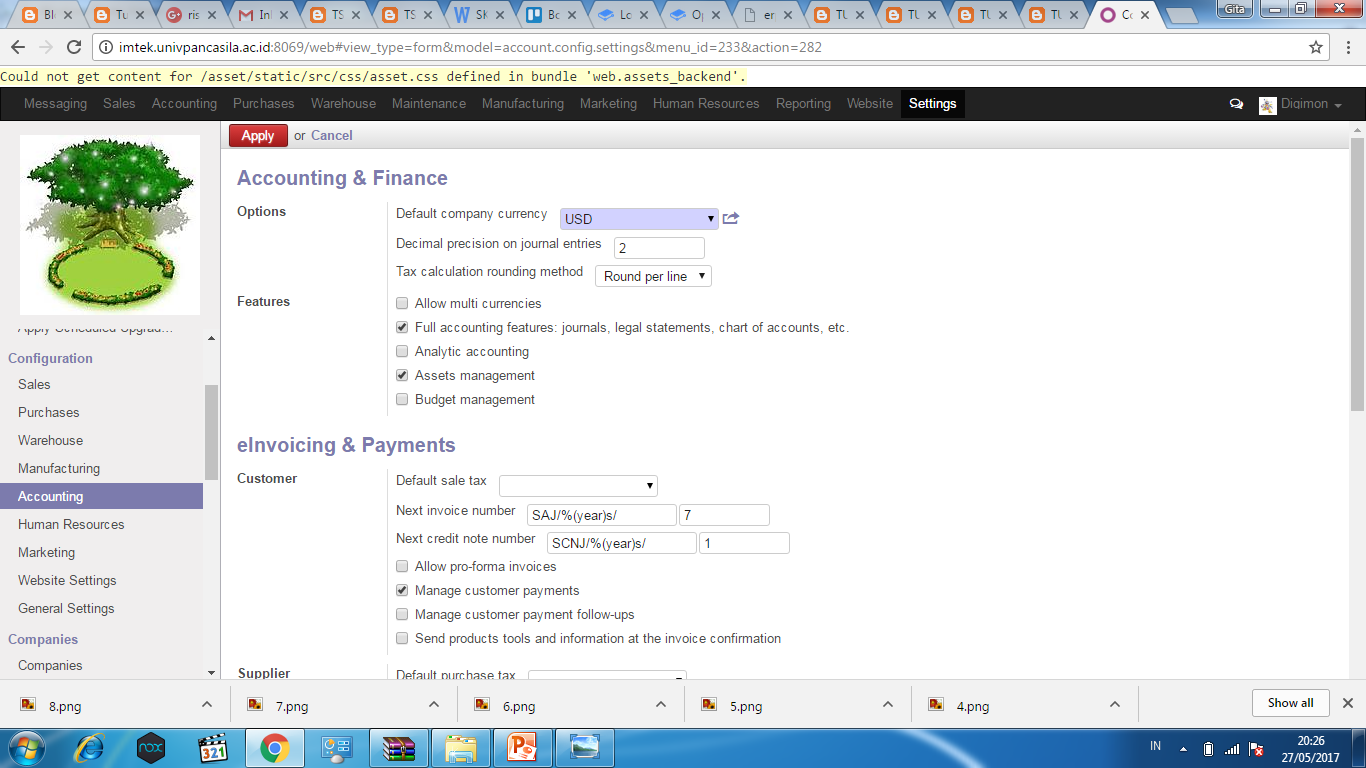 - Berikutnya masuk ke menu Settings > Accounting dan > Configuration. Dan pilih Default Company Currency IDR, Klik arah panah di samping IDR