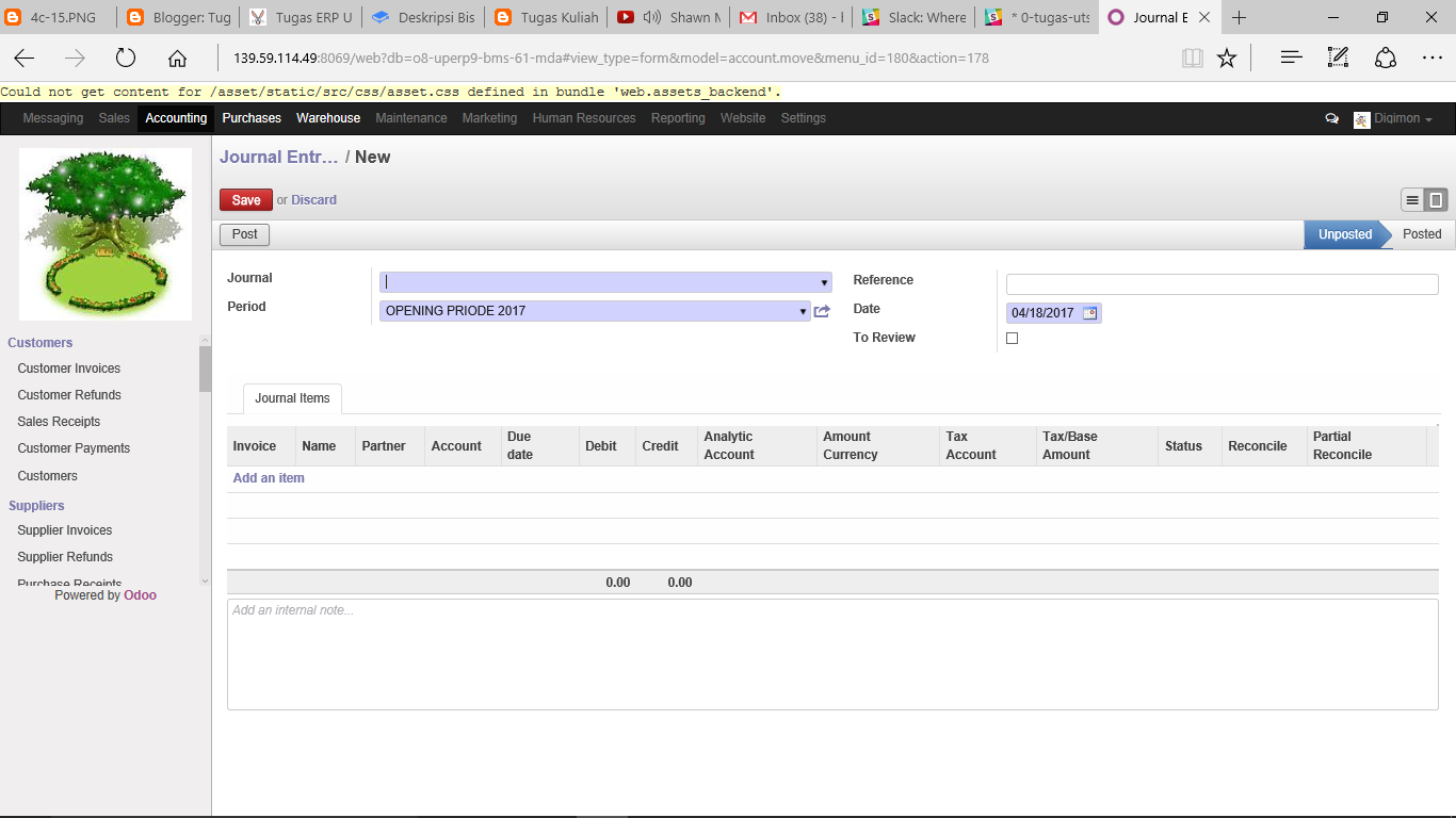 Kemudian isi data yang dibutuhkan, dan "save" bila jurnal ingin disimpan sebagai draft, "discard" bila ingin menghapus draft, dan "post" bila jurnal ingin dipublikasikan